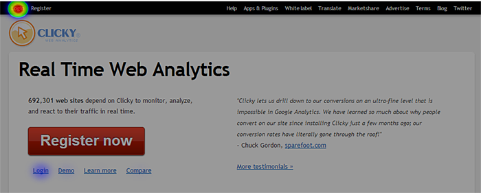 Most visitors coming to our site are already customers, so the two login links are going to be the most clicked items, by about a thousand miles. Of course, there are plenty of other clicks on this page (e.g. new people signing up are going to click the big ass "register" button), but we can't see them unless we apply some filters first, such as only showing visitors who completed our "new user" goal. It would be real nice to be able to see ALL the clicks on this page though, wouldn't it?