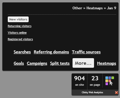 Second, we added a few new filter options when using heatmaps via the on site analytics widget. The new filters are under the "More..." menu, as shown below. These new filters allow you to view heatmaps for a page for just new visitors, returning visitors, visitors online now, or "registered" visitors. Registered means they have a "username" custom data field attached to them.