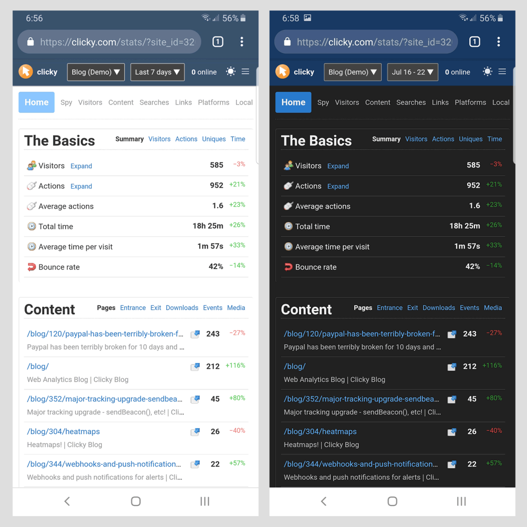 You can imagine a service as big and old as Clicky has built up a lot of cruft over the years! Making Clicky mobile friendly was going to be a big project no matter what, but I knew I was going to be updating so much of the layout code anyways that I should take the opportunity to gut it all and redo most of it from scratch and get with the times in terms of modern web design (e.g. CSS variables, and layout using grid and flex instead of floats and tables). This of course made the project considerably bigger, but I'm thrilled with the result, which we pushed out on Friday July 19.