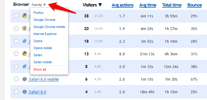 You can still view individual families. You'll just have to use the new menu system I built into these reports, as you can see in the screenshot below. This affects Browsers, OS's, Hardware, Campaigns, Custom data — I killed the search engines one since there were only a few categories anyways, and if you use split tests, those are also not grouped by family anymore because even people who do use that feature tend not to have more than one or two total.