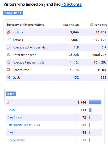 But is this the data we really want? This includes people who came to our homepage, perhaps logged in and viewed 1,000 reports, then logged out and left. We don't want these people included here. So, let's add a "number of actions" filter and set it "less than 5". This will now mainly be people who are not engaged with our web site at all.
