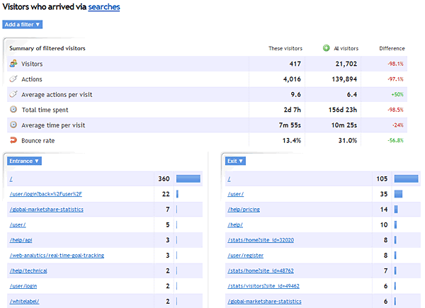 - View top pages, landing pages, and exit pages for any segment of visitors