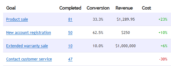 - Track revenue and costs: per site, per goal, and per visitor