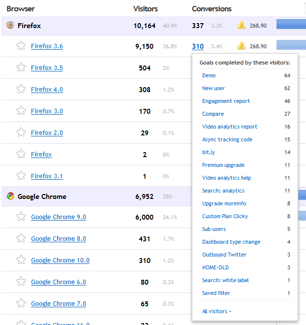 Now we'll show way more up front. As you can see in the screenshot below, we've added inline revenue to the reports, and when you click on the conversion number, it pops up a menu showing you all the individual goals that segment has completed, ordered most to least. You can click on any of those goals to immediately filter your visitors down to just that segment+goal, or click the "all visitors" link at the bottom to view visitors from that segment who have completed ANY goal.