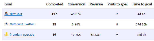 We've updated the main goal report to include a few new pieces of information. Tracking conversions is great, but wouldn't it also be nice to know how long it takes the average visitor to convert? That's exactly what we've added! Here's a snippet of our goal report, showing two goals that are very important to us — how many new people are registering, and how many people are upgrading. We offer a 21 day trial when new people register, but on average people are upgrading after only 14 days. That's fantastic! And for new users, it looks like the average person registers on their second visit after a 4 day lull from their first visit. Interesting!