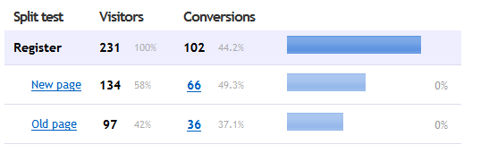 As should be evident, to make your split tests valid, you need a good sample size. There was absolutely no difference between what these visitors saw, yet the conversion rates are 49% vs 37%. I'll let this run indefinitely, at least until we get two different registration pages to actually test, to see what the differences end up being. They should converge with time.