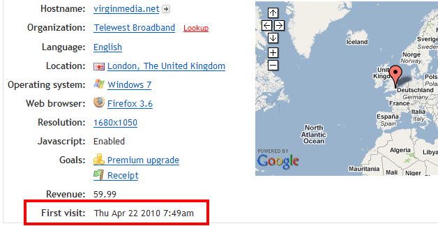 This feature will be particularly useful to those of you who use our goal system. We use goals to track when people upgrade to our premium service so we can see it right in our stats. (Of course, we have an admin area to see all of this data too, but it's more fun when it's in your stats). As you can see in this screenshot, taken from a visitor today (with all identifying info removed), this person first visited in… well, mid-April. The point is, we immediately know how long this person has been coming to our site before upgrading, and we can see it right in their session details. Fun!
